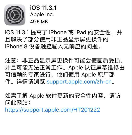现在,iOS 11.3.1就是为解决这个问题来的,其解决了部分使用非正品显示屏更换件的 iPhone 8 设备触控输入无响应的问题。