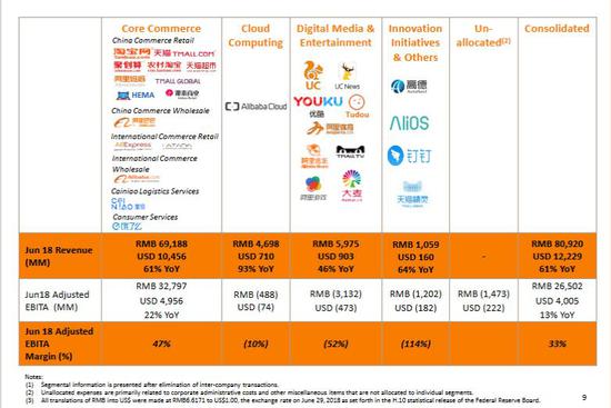 数字传媒与娱乐板块主要包括优酷、土豆、UC浏览器、UC新闻、阿里音乐、阿里体育、阿里游戏与大麦网等业务,创新战略业务主要包括高德地图、钉钉、AliOS与天猫精灵等业务。这些业务均入不敷出。
