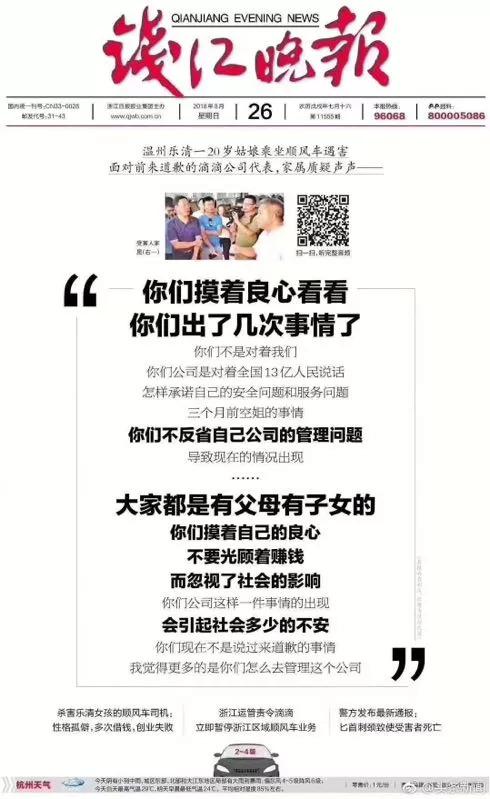 5月5日,河南郑州发生悲剧,21岁的空姐李某从郑州航空港区搭乘滴滴顺风车赶往市内,途中被司机强奸并杀害。8月24日,温州乐清同样发生类似惨案,20岁的赵某搭乘滴滴顺风车过程中被司机钟某所害。