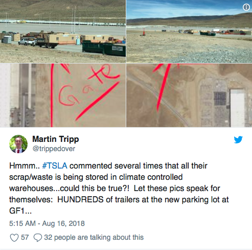 Tripp还在推特上发布了一些照片,声称特斯拉将废物废料存放在超级工厂的露天停车场和卡车上,而不是在温控仓库里。他还分享了一些截图,表示工厂内有大量废料。