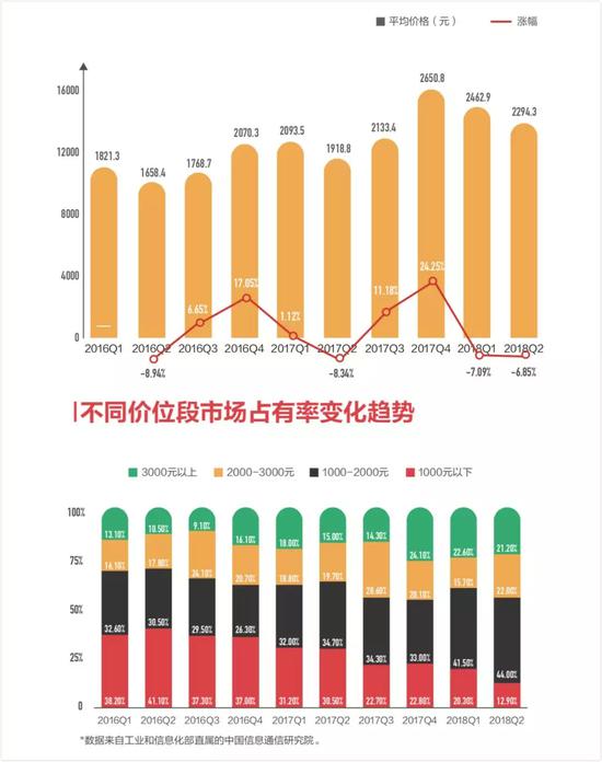 从 2017 年 4 季度的 2650 元到 2018 年 1 季度的 2462 元再到 2018 年 2 季度的 2294 元。3000 元以上价位手机销量也经历了 2 个季度的连续下滑。占比已经从过去的 24% 下滑到了 21%。