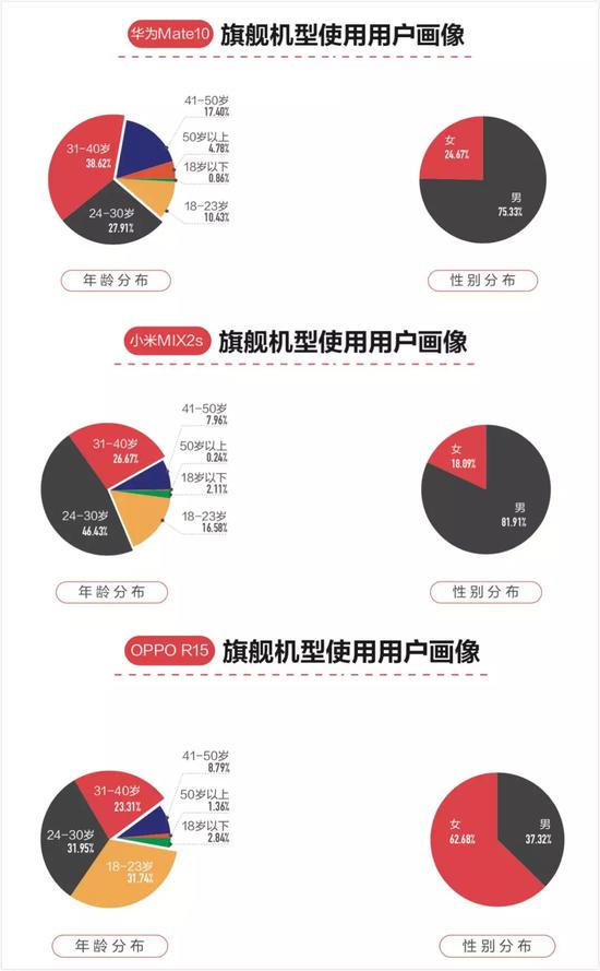 华为 Mate、小米 Max 系列针对的是年龄稍长一些的用户,要求屏幕大、续航长,诉求非常明确。华为 Mate10 用户男性占比 75%,30 岁以上用户占比在 60% 左右。这个数据比起小米 Mix2s 等机型 30 岁以上用户只有 30%、男性占比 81%,OPPO R15 30 岁以上用户占比只有 24%、女性用户超过 60% 来说,呈现了非常鲜明的特点。