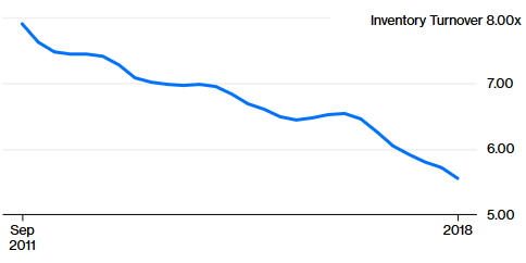 不过基本的库存增长不能够说明所有问题,因为销量的快速增长能够证明扩大库存的合理性。但事实上,收入增长幅度一直远低于库存增长。