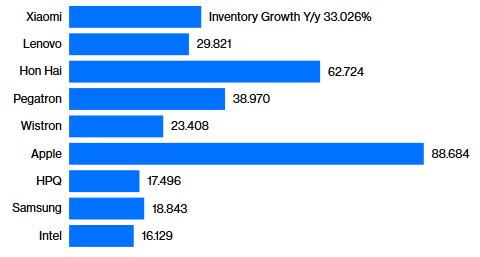 彭博社报道,包括苹果、三星、富士康、英特尔在内的一众硬件公司积压库存达到了金融危机以来的最高水平。