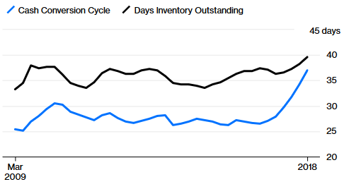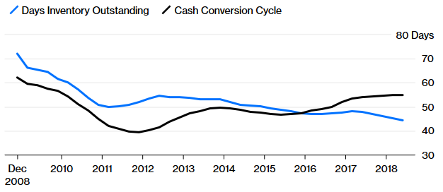 鸿海精密的现金流转换周期已经达到2008年来的最大增幅,同时也拥有未完成库存天数。这意味着苹果公司的主要供应商正在努力卖出手中的库存。但鸿海也有可能在下一步iPhone上市的爆发期重新建立库存。